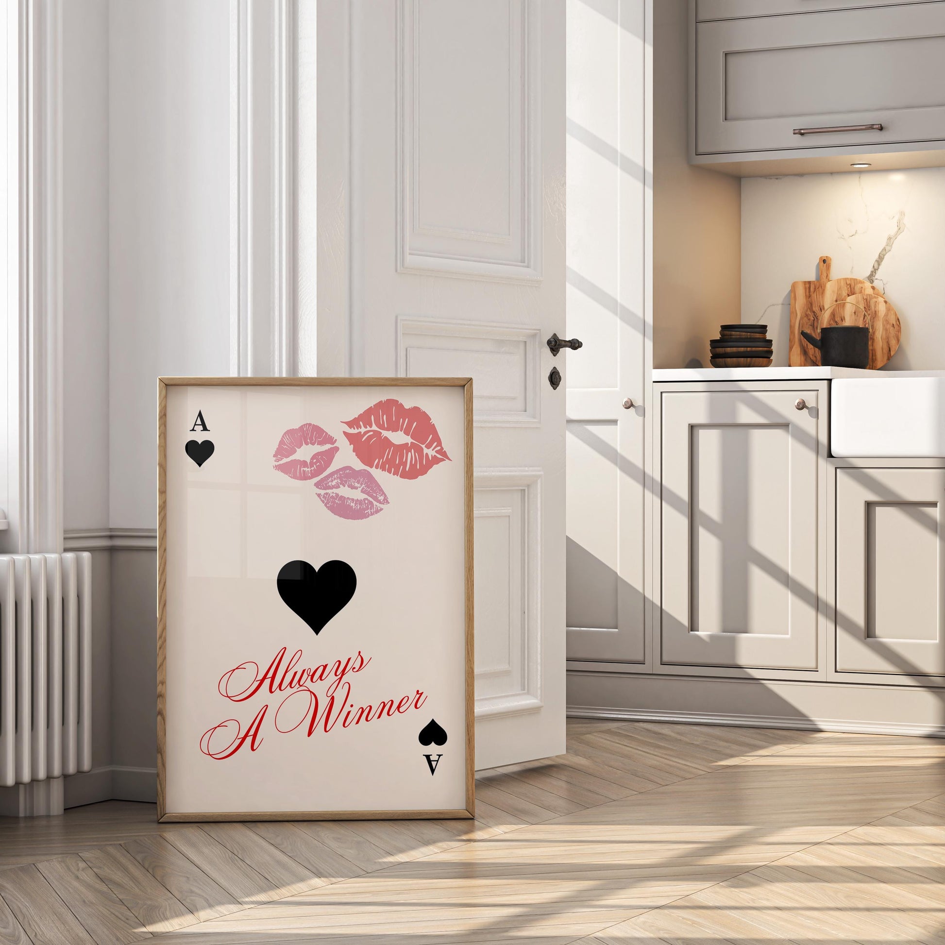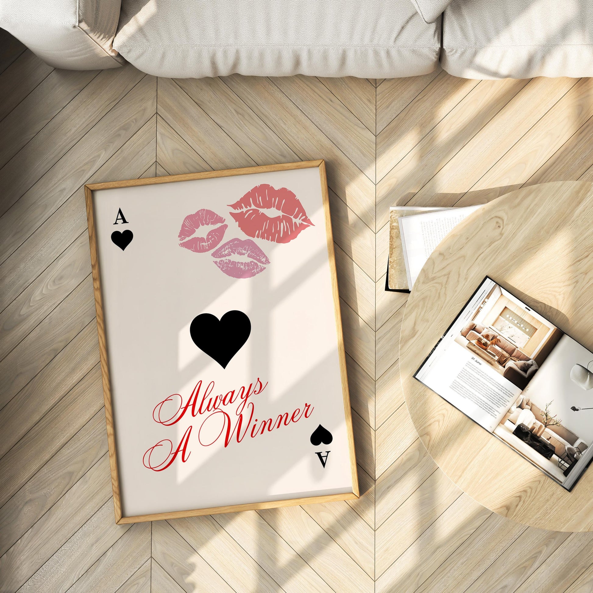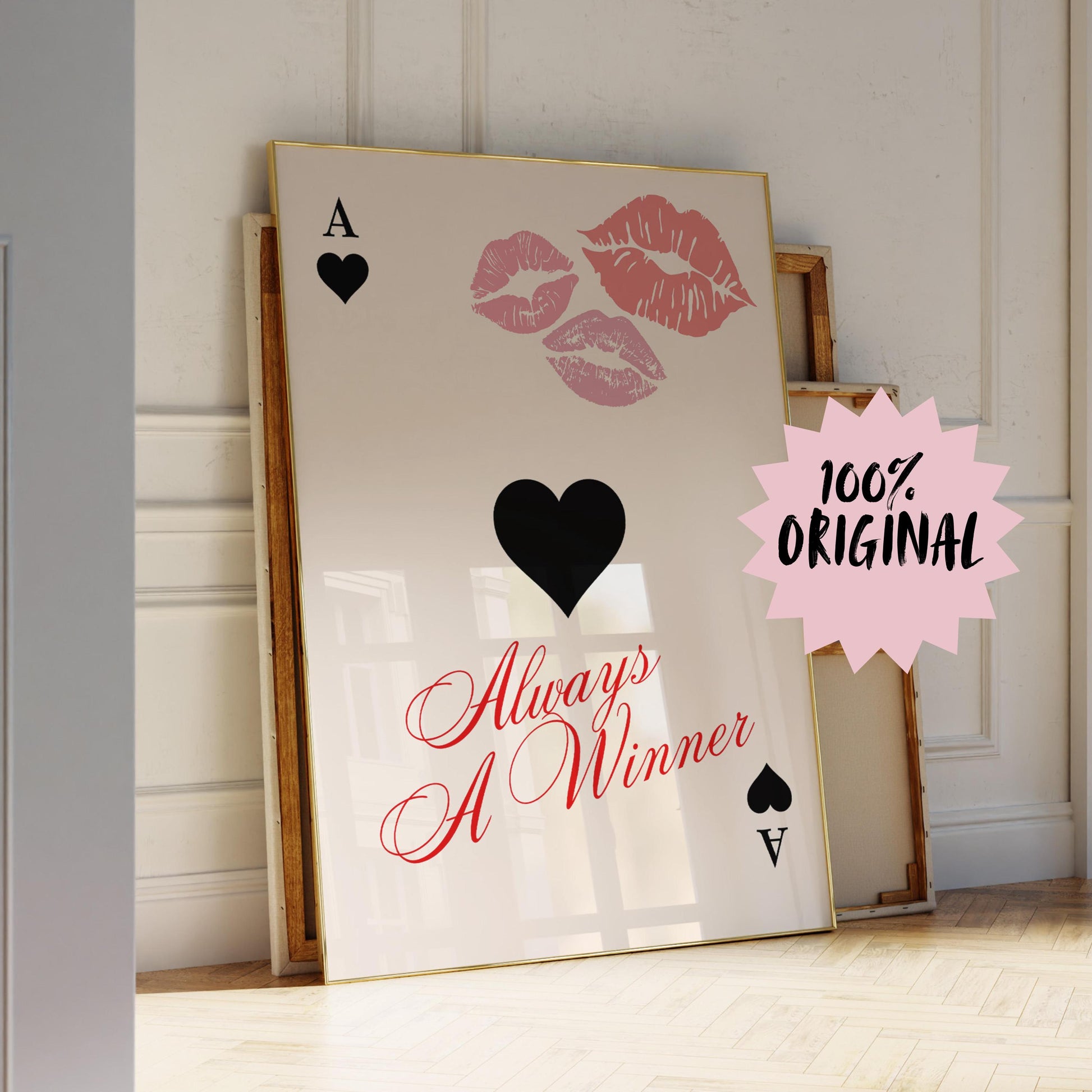 The Always a Winner Poster blends Y2K energy with coquette charm — featuring the iconic Ace of Hearts and soft pink lips typography. Perfect for those who love feminine strength, playful confidence, and statement wall art that inspires.