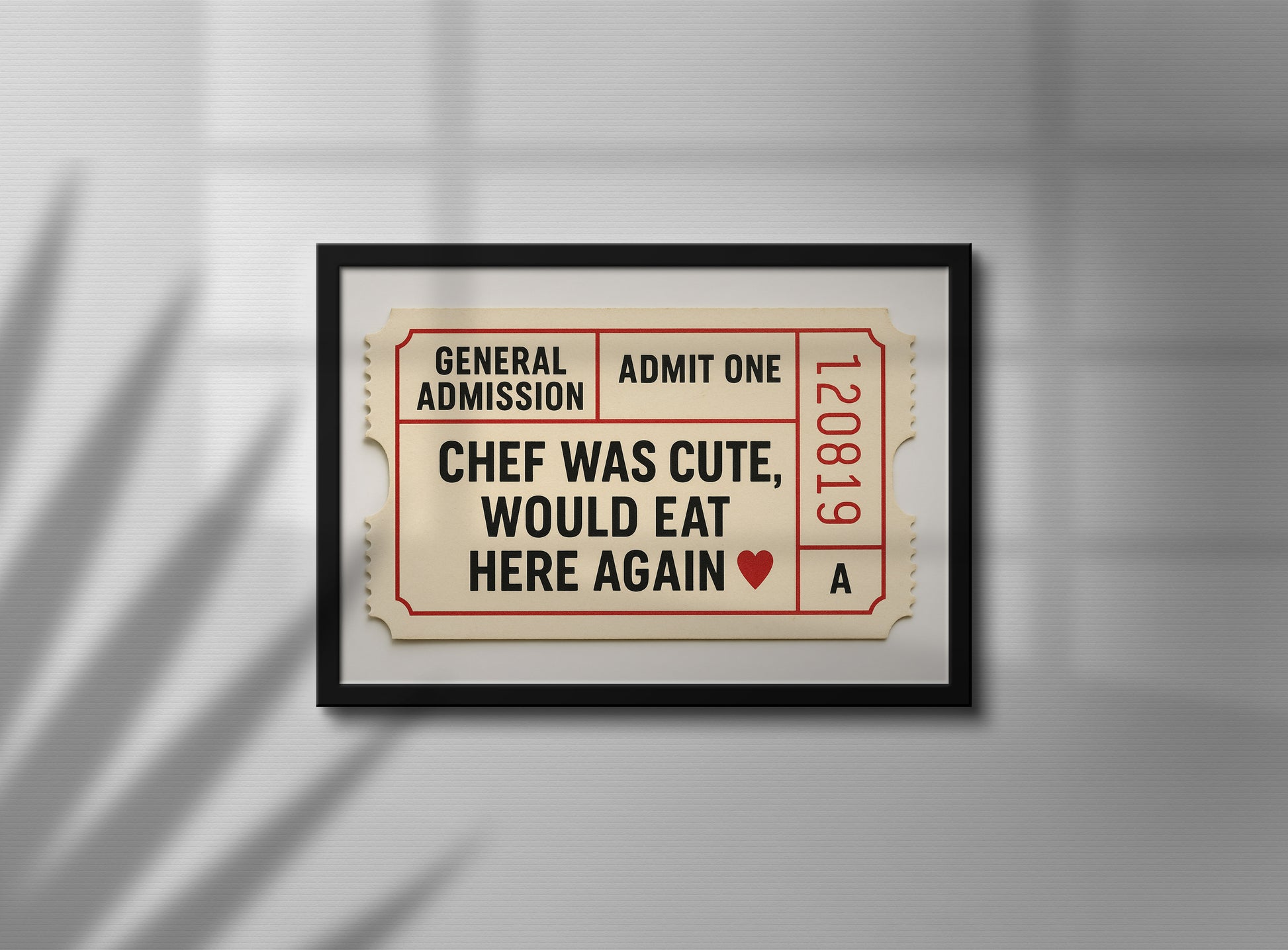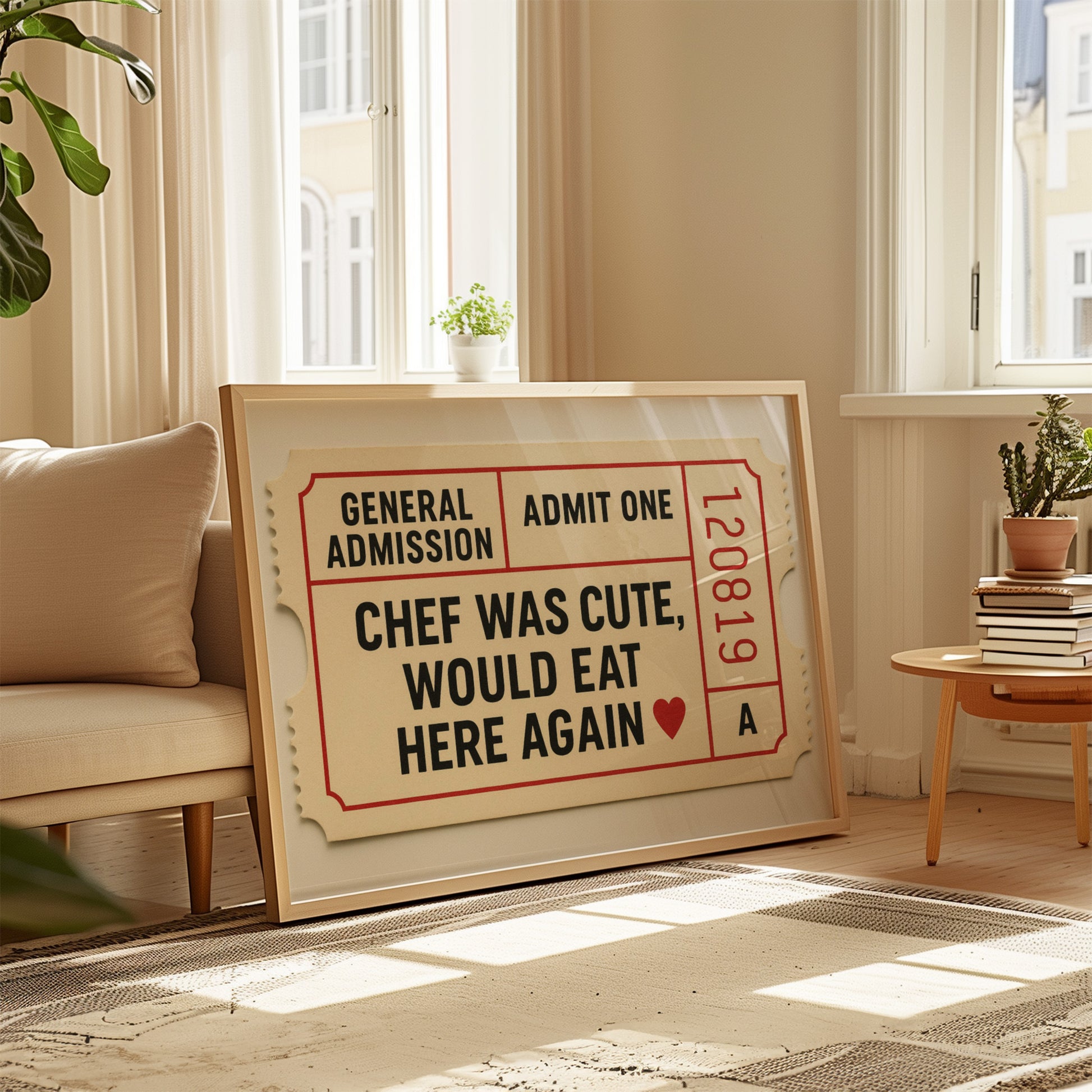 This poster brings a charming retro diner vibe into your kitchen, dining area, café, or apartment. With its witty message and vintage ticket-inspired design, it adds warmth, personality, and a touch of humor to any space. A perfect wall accent for food lovers, cozy interiors, and a fun yet stylish gift for those who appreciate good taste — in food and design.