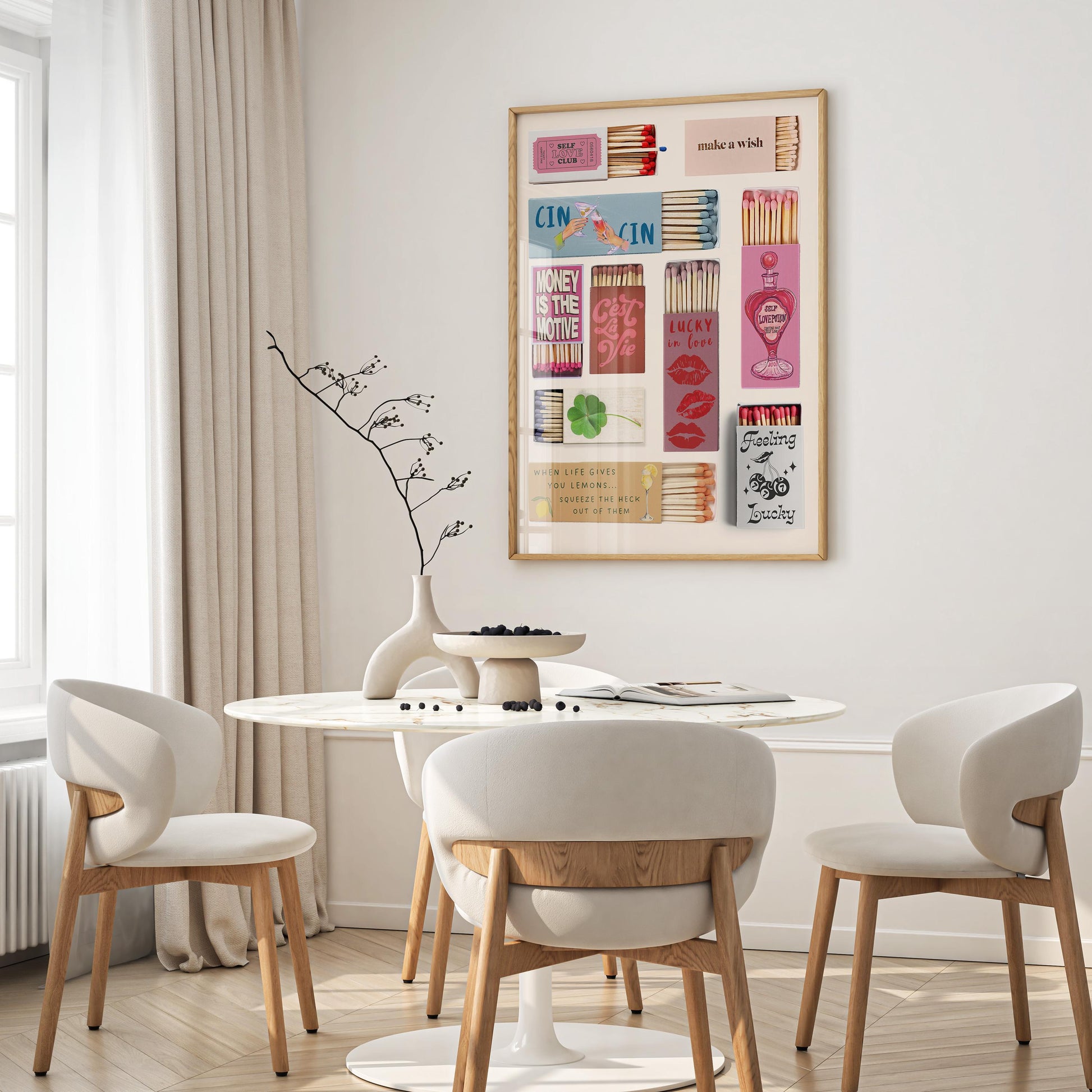 The Vintage Matchbox Poster captures retro charm through a modern lens — playful, bold, and effortlessly stylish. With its funky pink tones and minimalist aesthetic, this piece adds character and warmth to any room, from your living space to your creative studio.