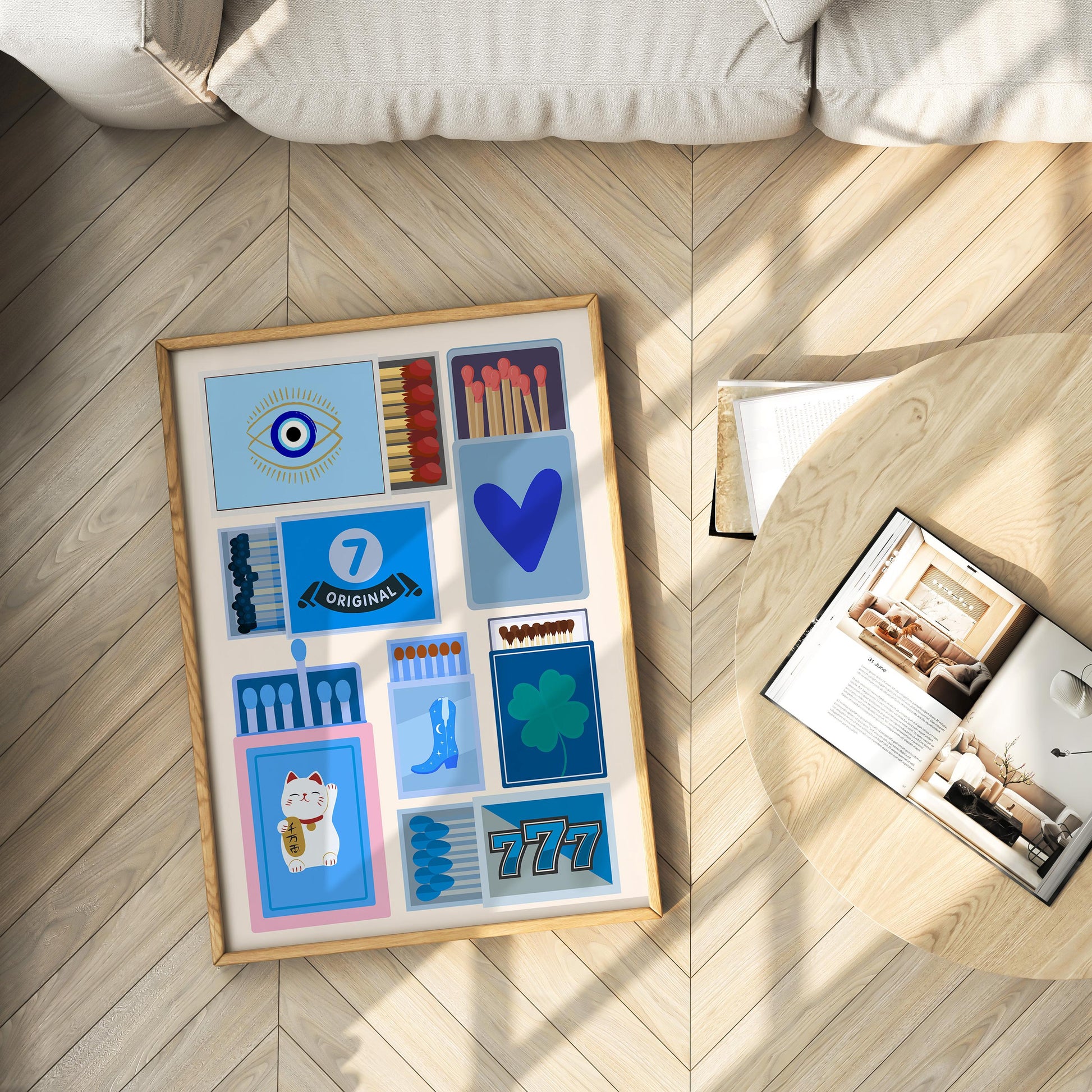 Vintage Blue Matchbox “Lucky You” Set of 3 — Digital Poster (B132)